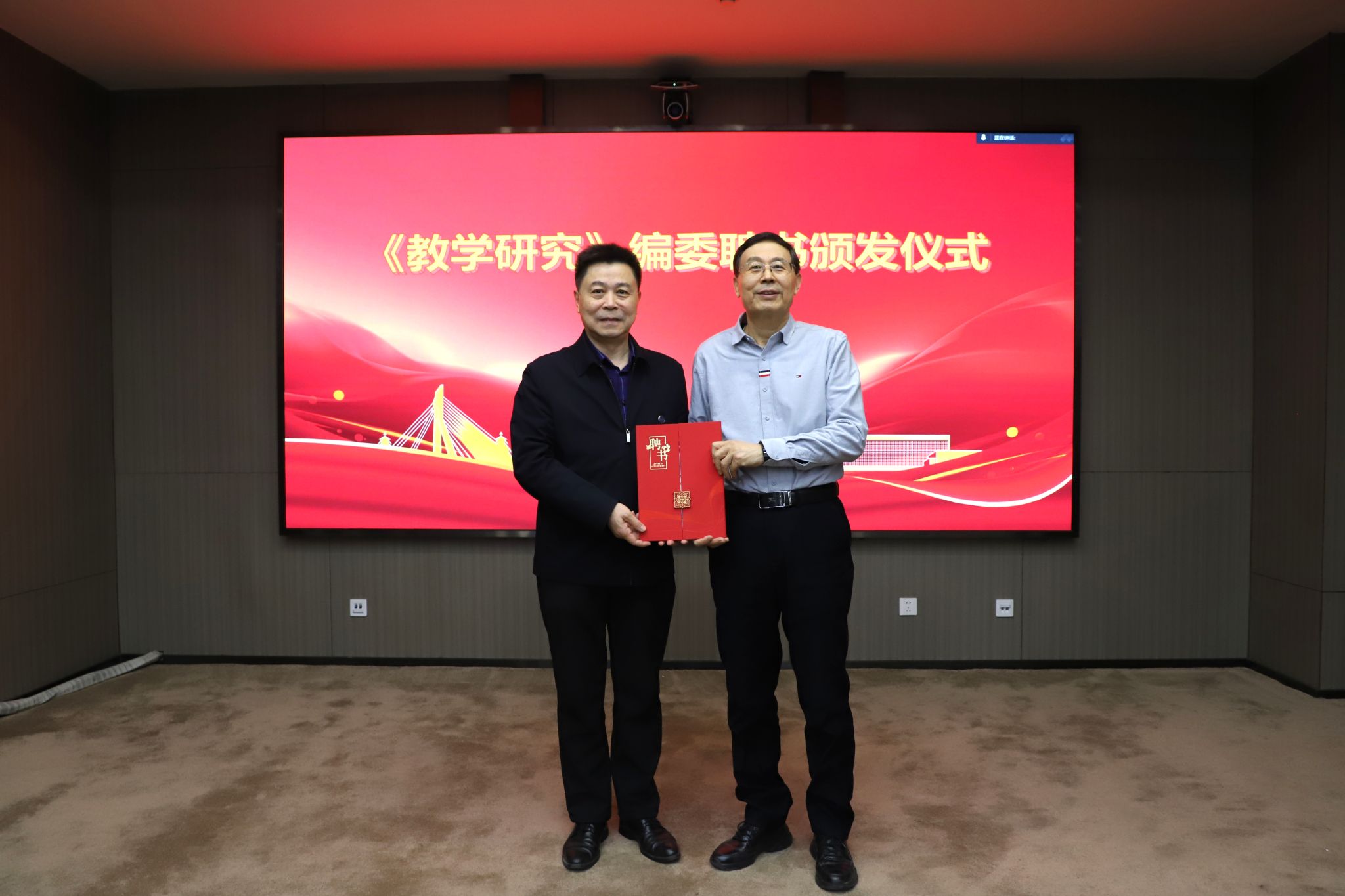 王德松副校长为编委会主任赵永生教授颁发聘书,副校长、《教学研究》主编李春玲为会场新一届编委颁发聘书。